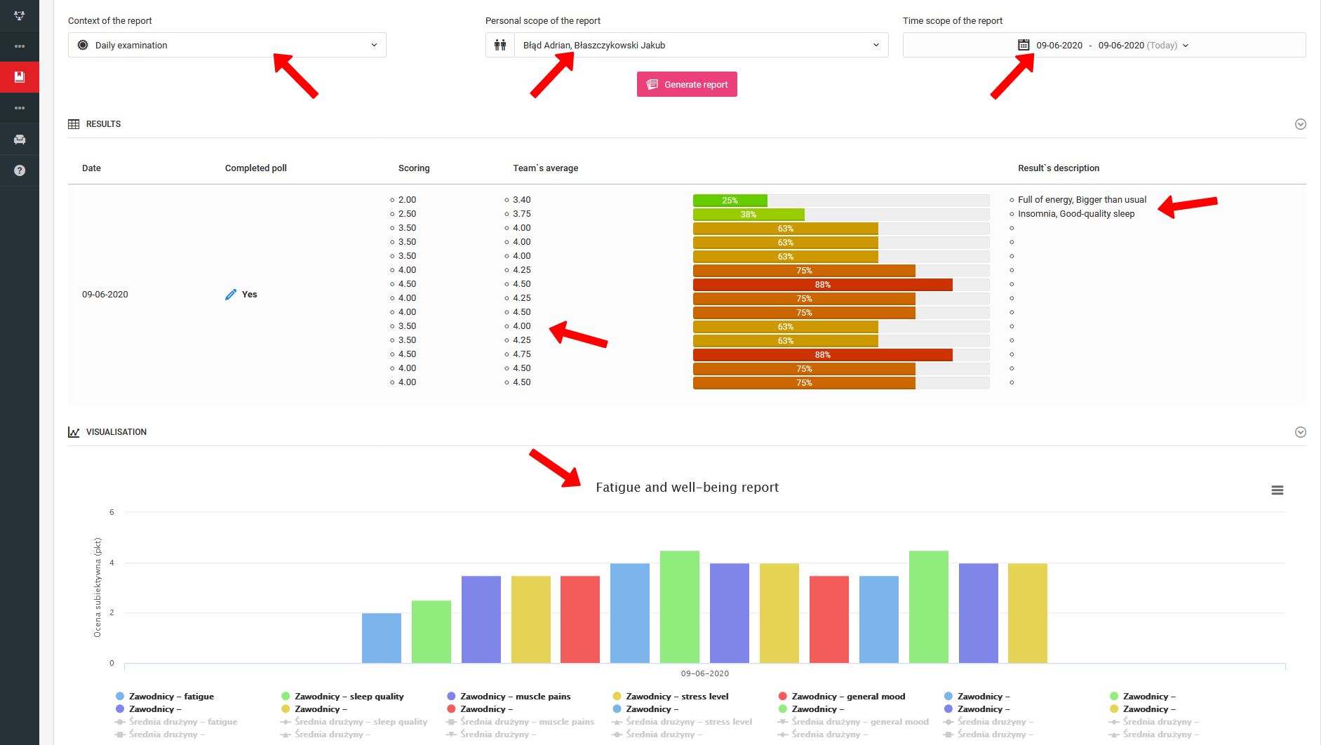 Systém má rozsáhlý modul reportů a analýz souvisejících s hodnocením subjektivní pohody a únavy hráčů. Pro přechod k reportům a analýzám klikněte v levém menu na deník analýza únavy reporty.