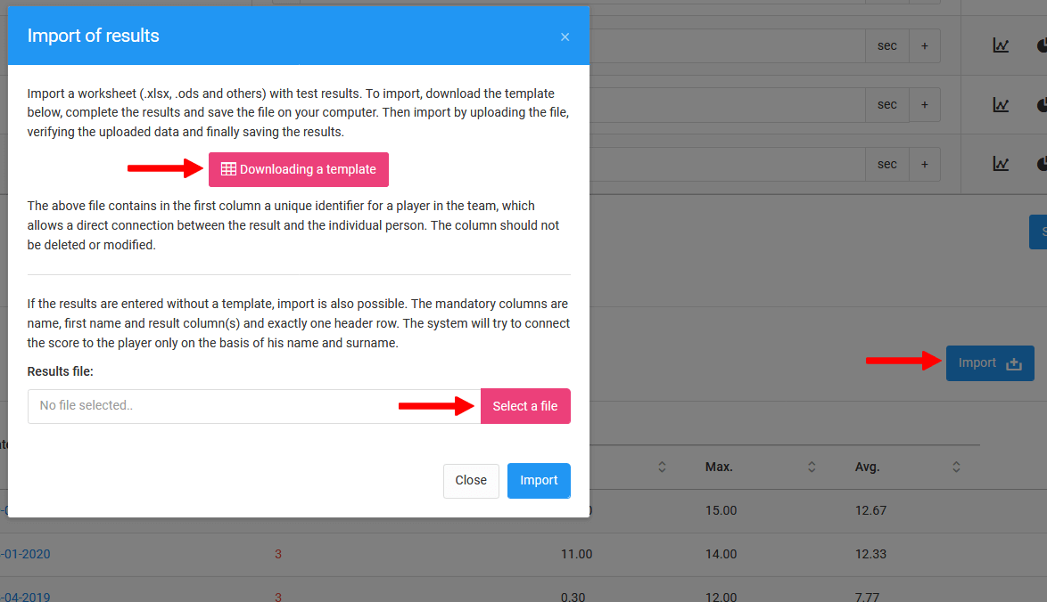 Systém umožňuje načíst výsledky testů z předem připraveného souboru xls. Chcete-li to udělat, klikněte na modrou ikonu "importovat" v okně pro zadávání výsledků testu. Kliknutí vyvolá okno, kde si můžete stáhnout šablonu souboru nebo načíst již vyplněný soubor xls. Abyste se ujistili, že data budou správně přečtena a přiřazena příslušným hráčům, doporučujeme použít šablonu souboru xls.