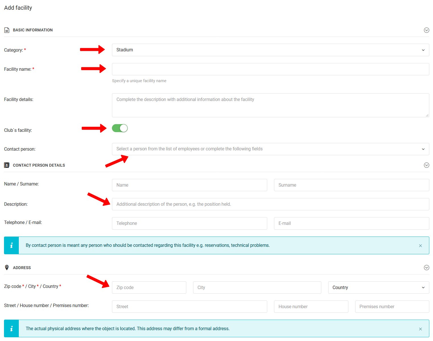 Im Formular haben Sie einige wichtige Felder auszufüllen. Das erste ist die Auswahl des Einrichtungstyps. Sie können zwischen Stadion, Trainingszentrum, Schule usw. wählen. Das nächste auszufüllende Feld ist der Name und die Beschreibung der Einrichtung. Geben Sie dann an, ob die Einrichtung dem Verein gehört, wenn Sie eine Kontaktperson auswählen müssen, wenn nicht, geben Sie die Details des Einrichtungseigentümers und der Kontaktperson ein. Im letzten Schritt vervollständigen Sie die vollständige, genaue Adresse der Einrichtung, die Sie in das System eingeben.