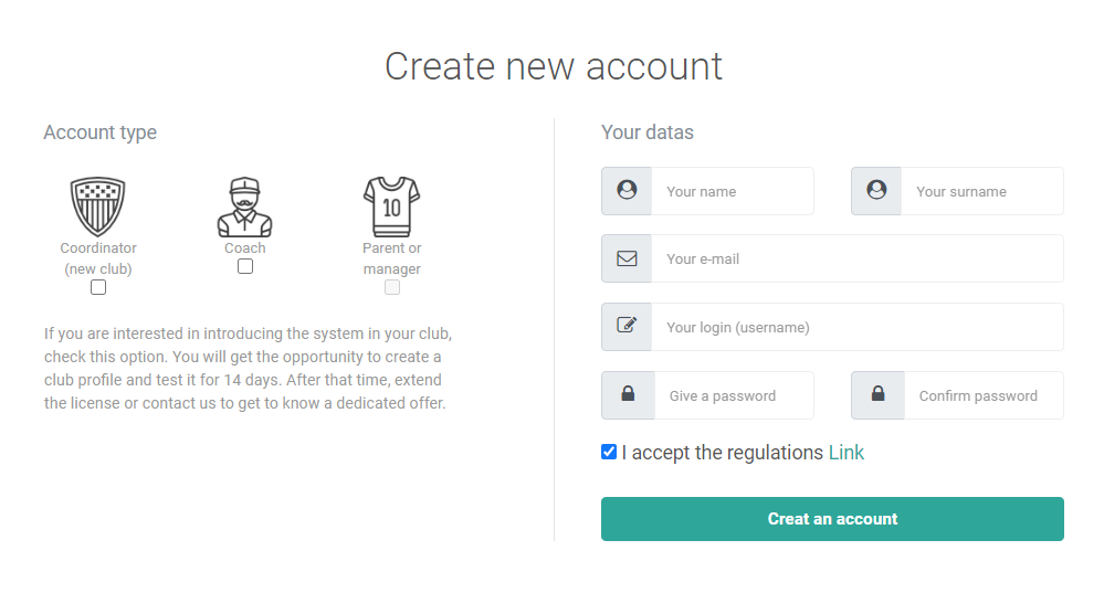 Um ein Konto bei ProTrainUp zu erstellen, geben Sie protrainup.com in Ihren Browser ein. Klicken Sie dann im oberen Menü auf den "Registrieren"-Button. Wählen Sie dann den Kontotyp aus, den Sie erstellen möchten. Sie können zwischen einem individuellen Trainerkonto oder einer Vereinslizenz wählen. Eltern- und Spielerkonten werden immer von den Trainern oder Koordinatoren erstellt.