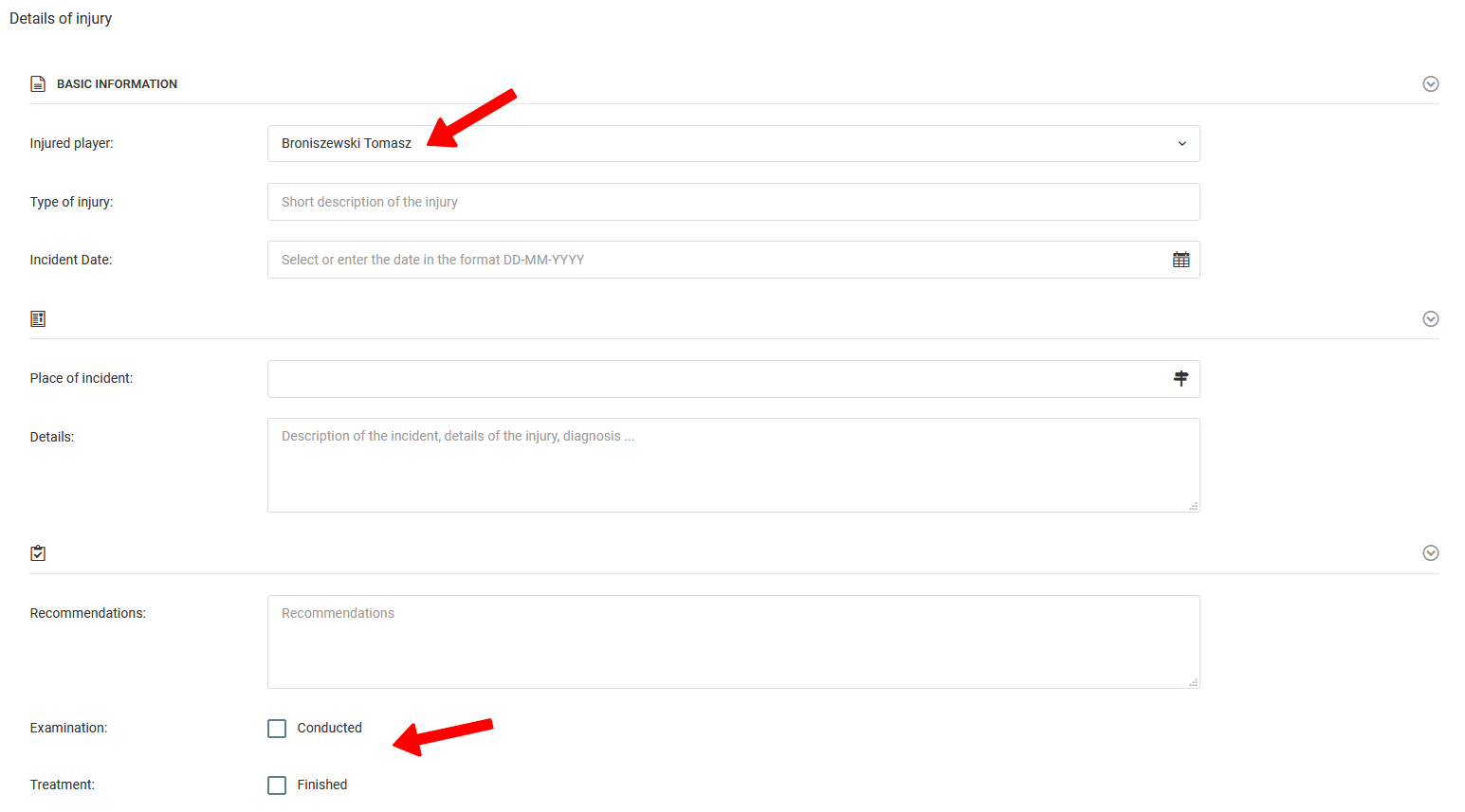 Um eine Verletzung hinzuzufügen, wählen Sie im linken Menü Tagebuch Verletzungen Verletzung hinzufügen. Füllen Sie die im erscheinenden Formular erforderlichen Daten aus, beginnend mit dem Namen des verletzten Spielers. Die eingegebene Verletzung kann jederzeit modifiziert werden, z.B. um ein Kontrolldatum festzulegen oder die Behandlung zu beenden.