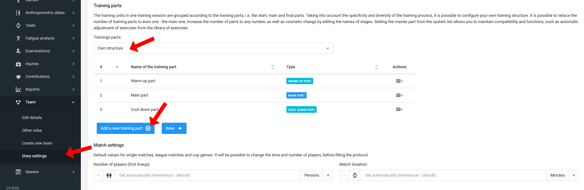 Das System gibt Ihnen die Möglichkeit, Ihre eigene Entwurfsstruktur zu erstellen. Standardmäßig gibt es drei Trainingsteile im Entwurf: den Anfangs-, Haupt- und Schlussteil. Mit dieser Funktion können Sie eine beliebige Anzahl und Reihenfolge von Trainingsteilen festlegen. Die Teile können auf Vereinsebene festgelegt und dann von den Teams übernommen oder individuell für ein bestimmtes Team erstellt werden. Sie können Ihre eigene Entwurfsstruktur im Reiter Tagebuch Team Tagebucheinstellungen festlegen.