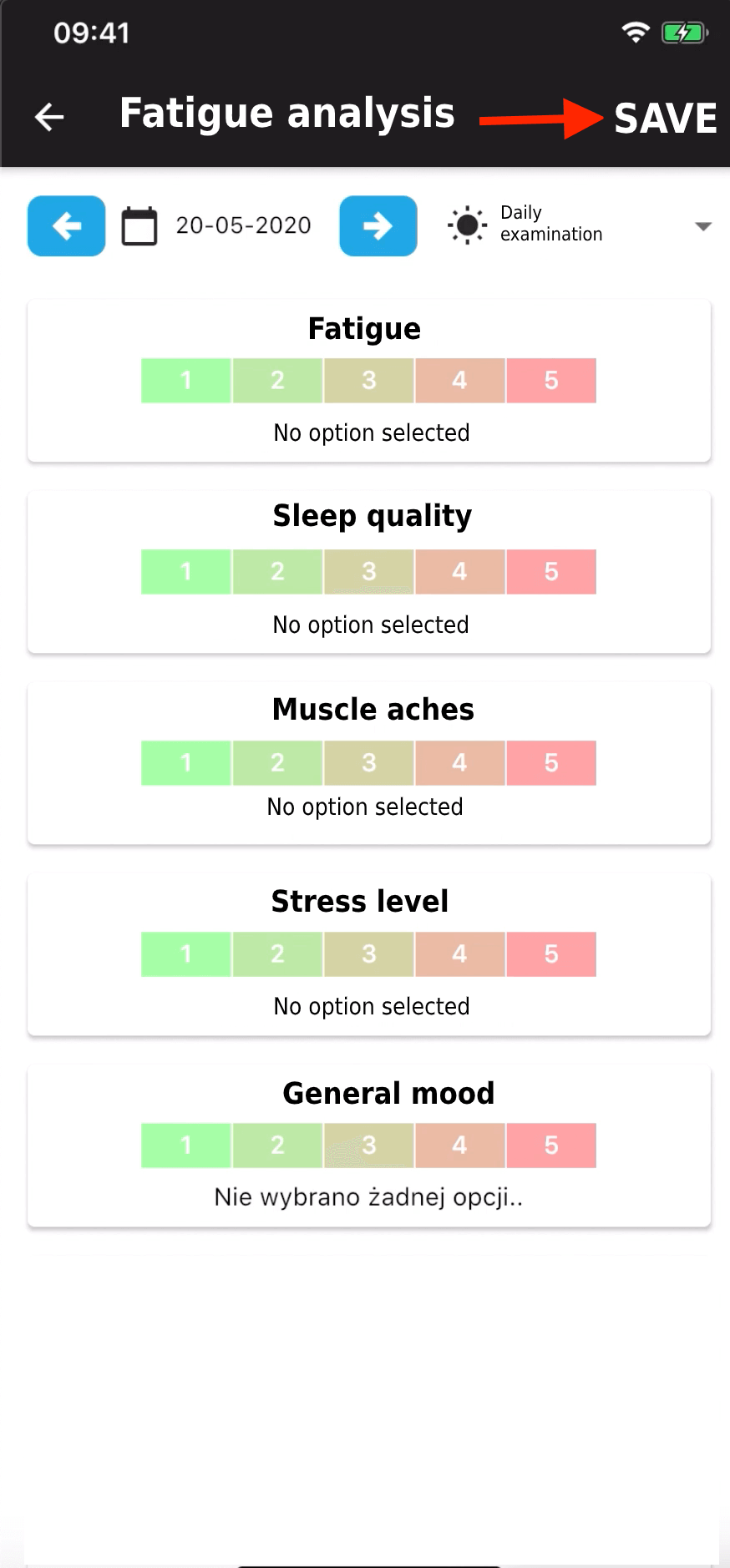 Después de hacer clic en la notificación o después de hacer clic en el menú izquierdo diario análisis de fatiga tabla de resultados, el jugador será llevado a la vista de la encuesta. Dependiendo del tipo de encuesta elegido, aparecerá el número apropiado de preguntas. Recuerda que hay varias condiciones que deben cumplirse para asegurarse de que el jugador reciba una notificación push y la posibilidad de completar la encuesta apropiada en caso de una encuesta posterior al entrenamiento y posterior al partido.