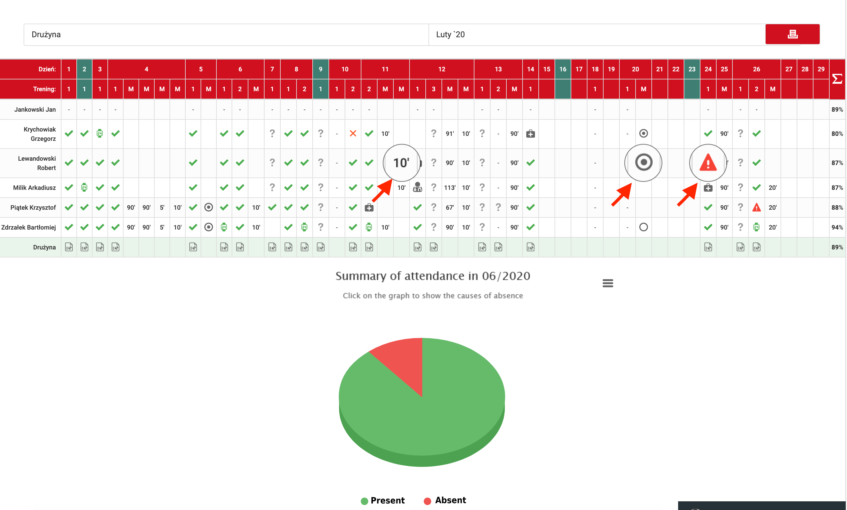 Sous le tableau se trouve un graphique en secteurs montrant la présence pour la plage de données sélectionnée, dans le mois choisi. Il est important de noter que ce graphique est interactif. Lorsque vous cliquez sur la zone rouge, le graphique affichera des données détaillées sur les raisons d'absence aux séances d'entraînement.