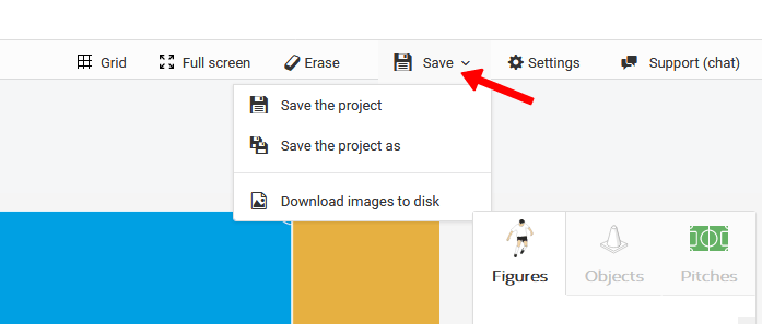 Le système vous donne trois options de sauvegarde. Pour en sélectionner une, cliquez sur le bouton "sauvegarder" dans le menu de fonction supérieur. Le dessin graphique créé peut être sauvegardé comme un projet, une variation du projet actuellement ouvert ou comme un fichier png sur votre ordinateur. Les projets sauvegardés apparaîtront dans votre bibliothèque d'exercices privée.