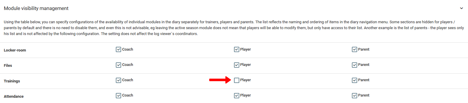 Un autre élément des paramètres qui affecte une partie significative du système est le module pour masquer les éléments du journal pour les groupes d'utilisateurs individuels. Pour masquer ou afficher le module pour un groupe d'utilisateurs sélectionné, allez au menu de gauche à club paramètres modules de masquage. Comme vous pouvez le voir dans l'image ci-dessous, la gestion de la visibilité des modules est basée sur la sélection ou la désélection d'éléments choisis et la fonctionnalité du journal. En désélectionnant un élément donné, il disparaîtra du menu sur les comptes du groupe d'utilisateurs sélectionné. Dans le cas montré dans l'image, l'accès à l'onglet d'entraînement a été bloqué pour les joueurs. N'oubliez pas que ces paramètres s'appliquent à tous les utilisateurs d'un groupe donné dans l'entité que vous gérez.