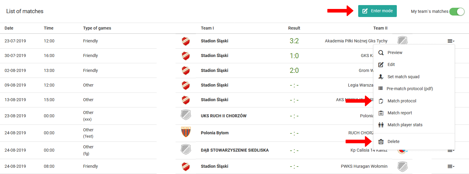 Je hebt twee opties om de uitslag in te voeren. Basis en geavanceerd. Bij de eerste kun je alleen de score van de wedstrijd invoeren. Om deze in te voeren, klik je op de groene knop "invoermodus". De tweede, geavanceerde optie is beschikbaar via het menu van de wedstrijd (laatste kolom in de tabel). Om naar de geavanceerde invoer van de wedstrijduitslag te gaan, selecteer je de optie "wedstrijdprotocol" in het menu.