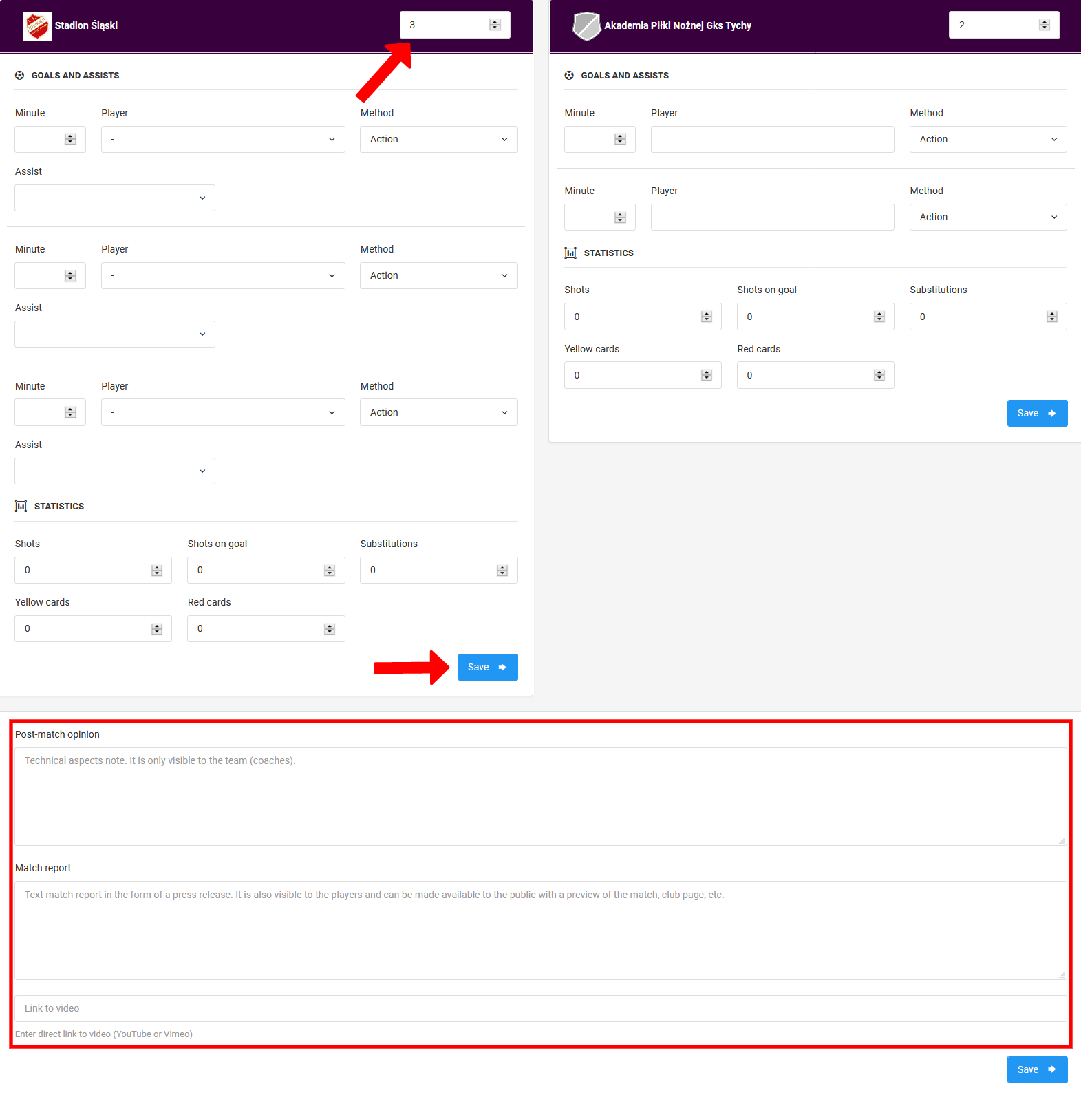 De geavanceerde weergave stelt je in staat om uitgebreide statistieken voor een wedstrijd in te voeren. In dit venster kun je, afhankelijk van de gekozen sport, informatie invoeren over: doelpunten, punten, assists, schoten, wissels, straffen en hoe doelpunten werden gescoord. Vergeet niet om het formulier elke keer op te slaan. Door de kwantitatieve gegevens op te slaan kun je ook kwalitatieve gegevens toevoegen zoals doelpuntenmakers, assist-gevers, etc. Onder het formulier vind je drie tekstvelden: wedstrijdmening, wedstrijdverslag en een link naar de video.