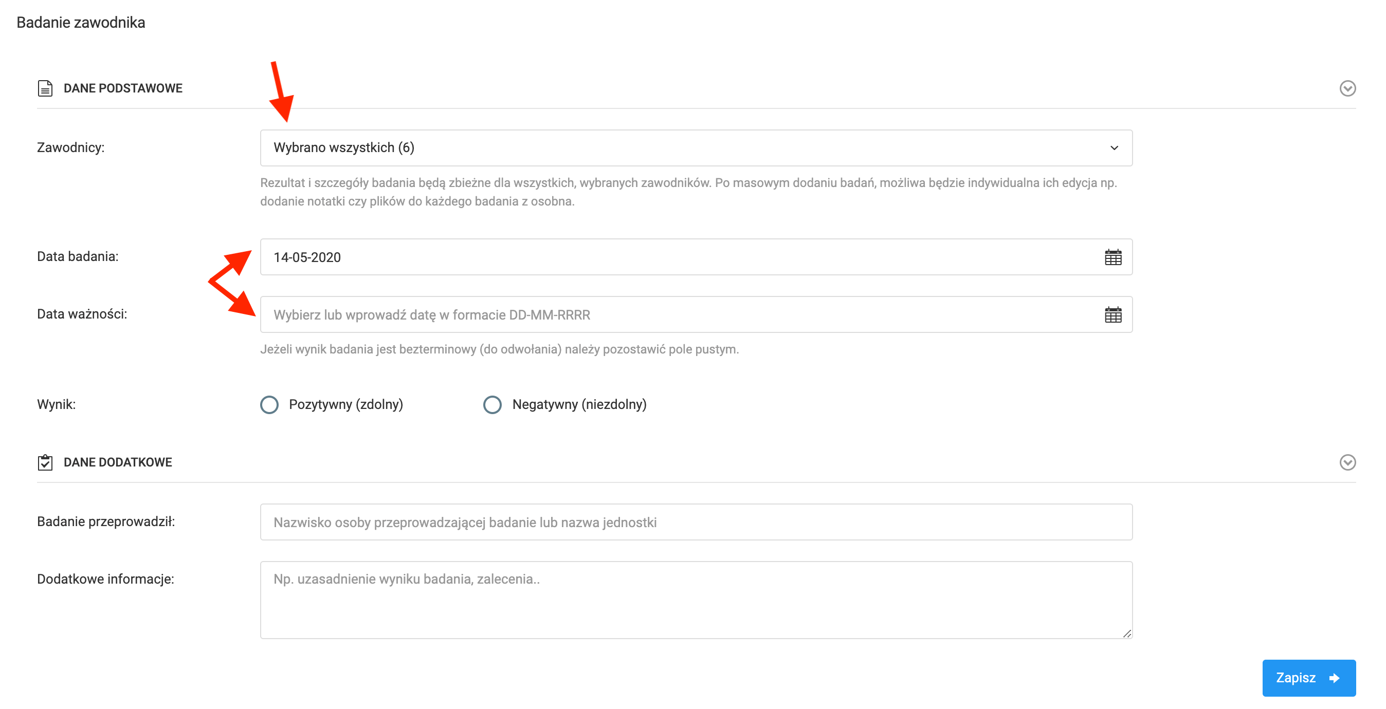 Aby wprowadzić informacje na temat badań lekarskich z lewego menu wybierz opcję dziennik badania dodaj badanie. Po kliknięciu przeniesiony zostaniesz na stronę wprowadzania informacji na temat przeprowadzonego badania. Na stronie tej będziesz miał do wprowadzenia kilka istotnych elementów. Pierwszy z nich to lista zawodników, których dotyczy badanie. Mogą to być wszyscy zawodnicy, określona grupa lub pojedynczy gracz. Kolejne pola do uzupełnienia to: data przeprowadzenia badania oraz data ważności badania. Ponadto możesz oznaczyć wynik badania (zdolny/niezdolny) oraz dodać dane osoby przeprowadzającej badanie.