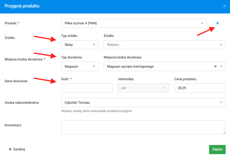 Kolejny etap to wybranie źródła, z którego nastąpi przyjęcie produktu na magazyn. Na liście wyboru masz do wybrania kilka pozycji m.in. sklep, sponsor czy inny magazyn. Następnie musisz ustalić gdzie ma trafić dodawany produkt, domyślnie jest to magazyn, w którym rozpocząłeś procedurę przyjęcia sprzętu na magazyn. Następnie uzupełnij ilość oraz cenę produktu. W kolejnym kroku wybierz osobę odpowiedzialną za przyjęcie sprzętu na magazyn. Domyślnie jest to osoba, która to przyjęcie wprowadza do systemu. Ostatni krok, to możliwość wprowadzenia komentarza. Po uzupełnieniu wszystkich obowiązkowych pól, pozostaje zapisanie przyjęcia. Aby to zrobić kliknij w zielony przycisk „zapisz” w prawym dolnym rogu okna.