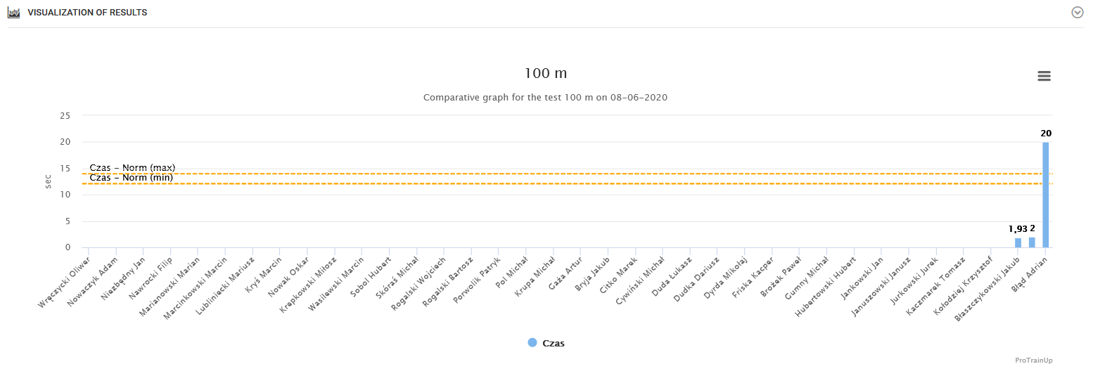 Izpolnitev rezultatov testa v ustvarjanju poročil v obliki grafičnih tabel. Pod rezultati vsakega testa, je samodejna ustvarjena razdelitev danega merjenja, ustvarjena v obliki stolpičnega diagrama. Poleg tega je za vsakega tekmovalca zgodovina meritev danega testa ustvarjena posebej. Graf prikazuje zgodovino rezultatov danega igralca.